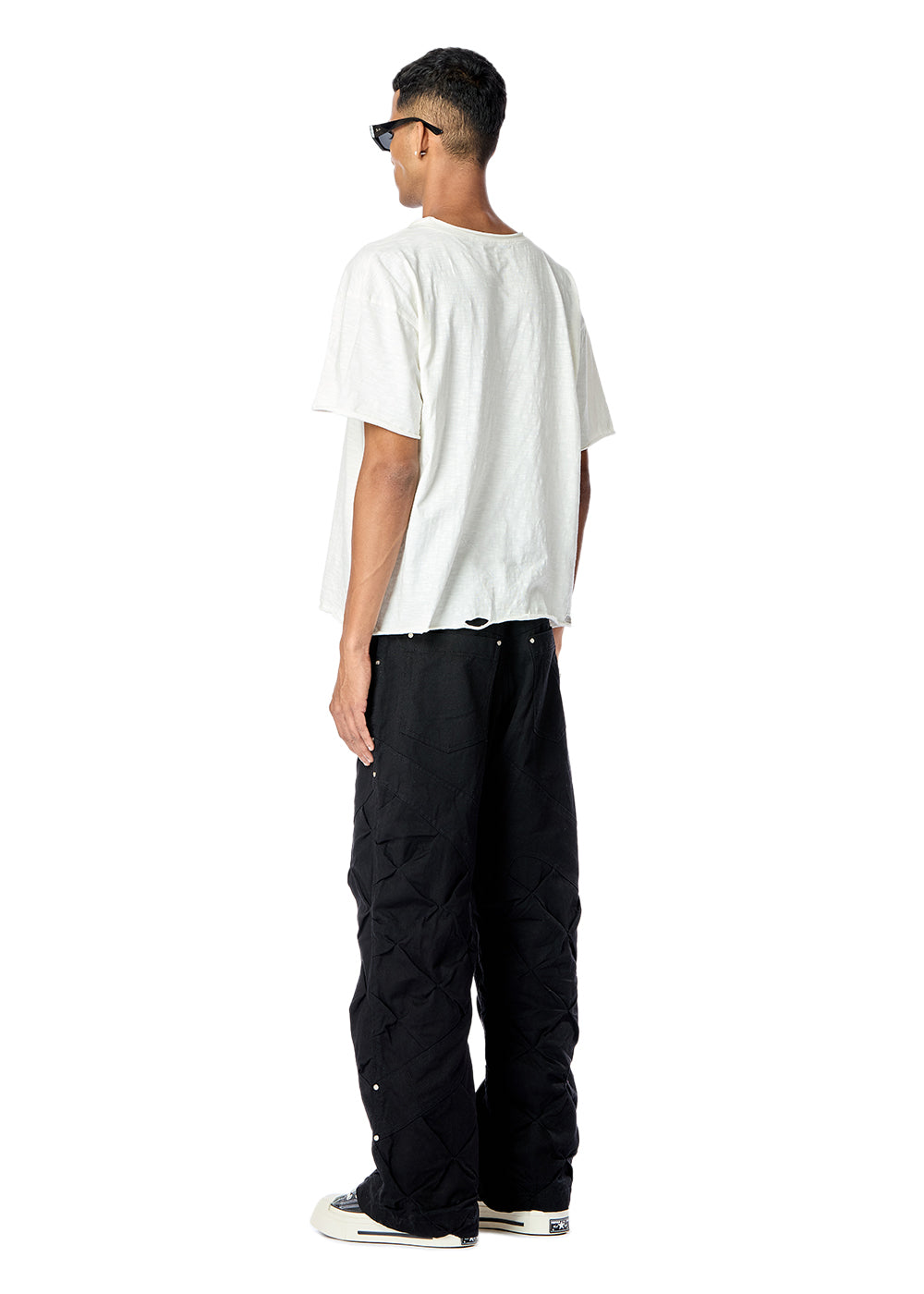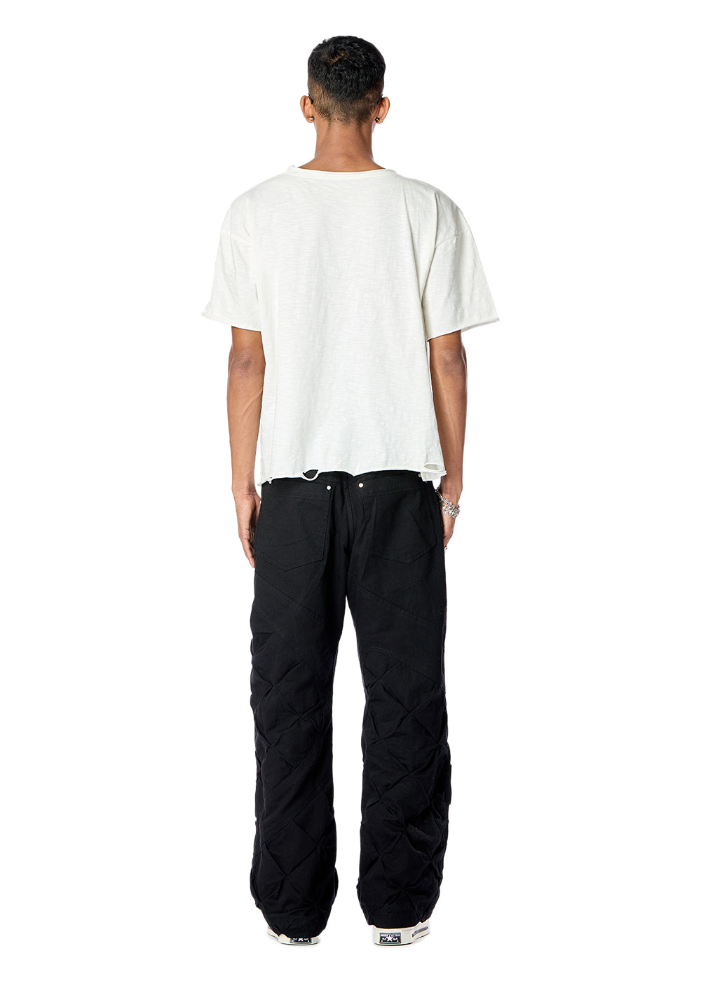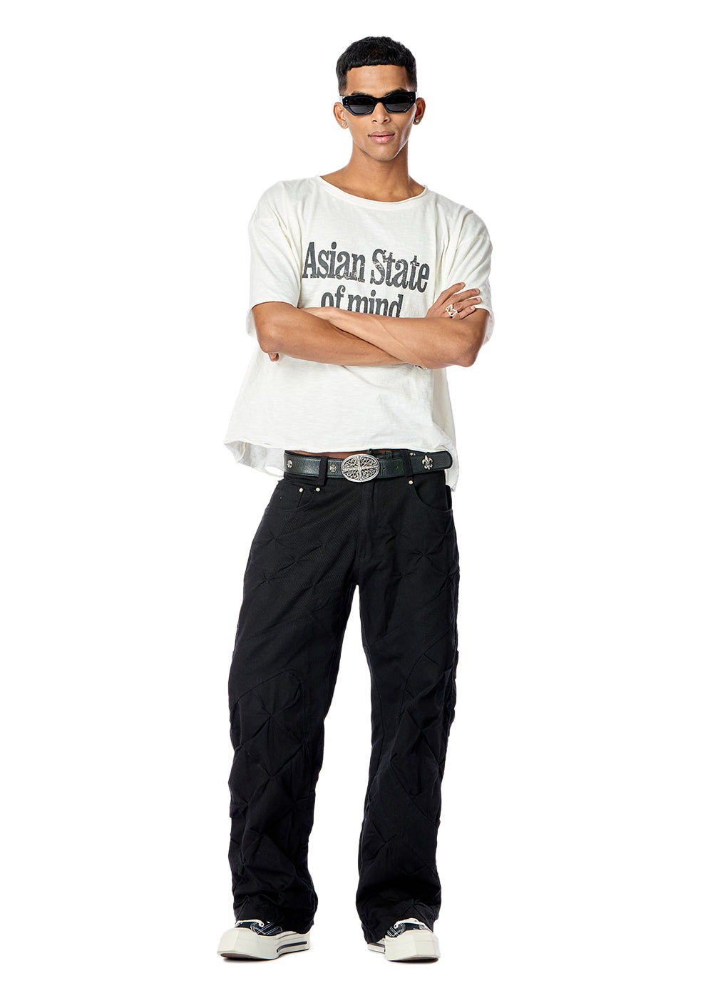This T-shirt is crafted from soft slub fabric and features a scoop neckline with a cropped, relaxed fit. The front showcases a grunge-style screen-printed quote, “Asian State of Mind.” The sleeves and hems are left raw for an intentionally rugged, unfinished look.