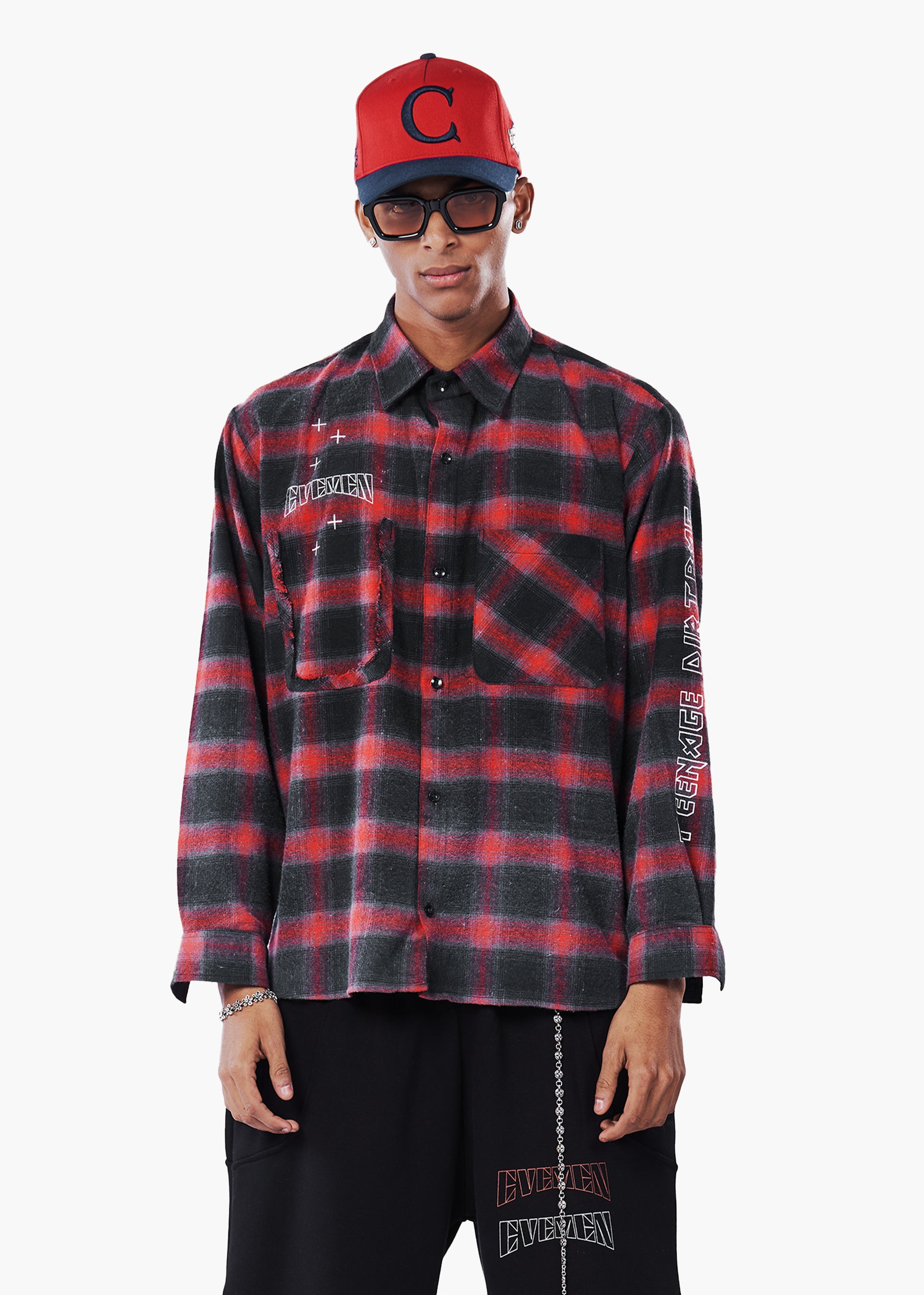 This Red and Black Flannel shirt has an oversized fit. It has EVMN Branding in front.