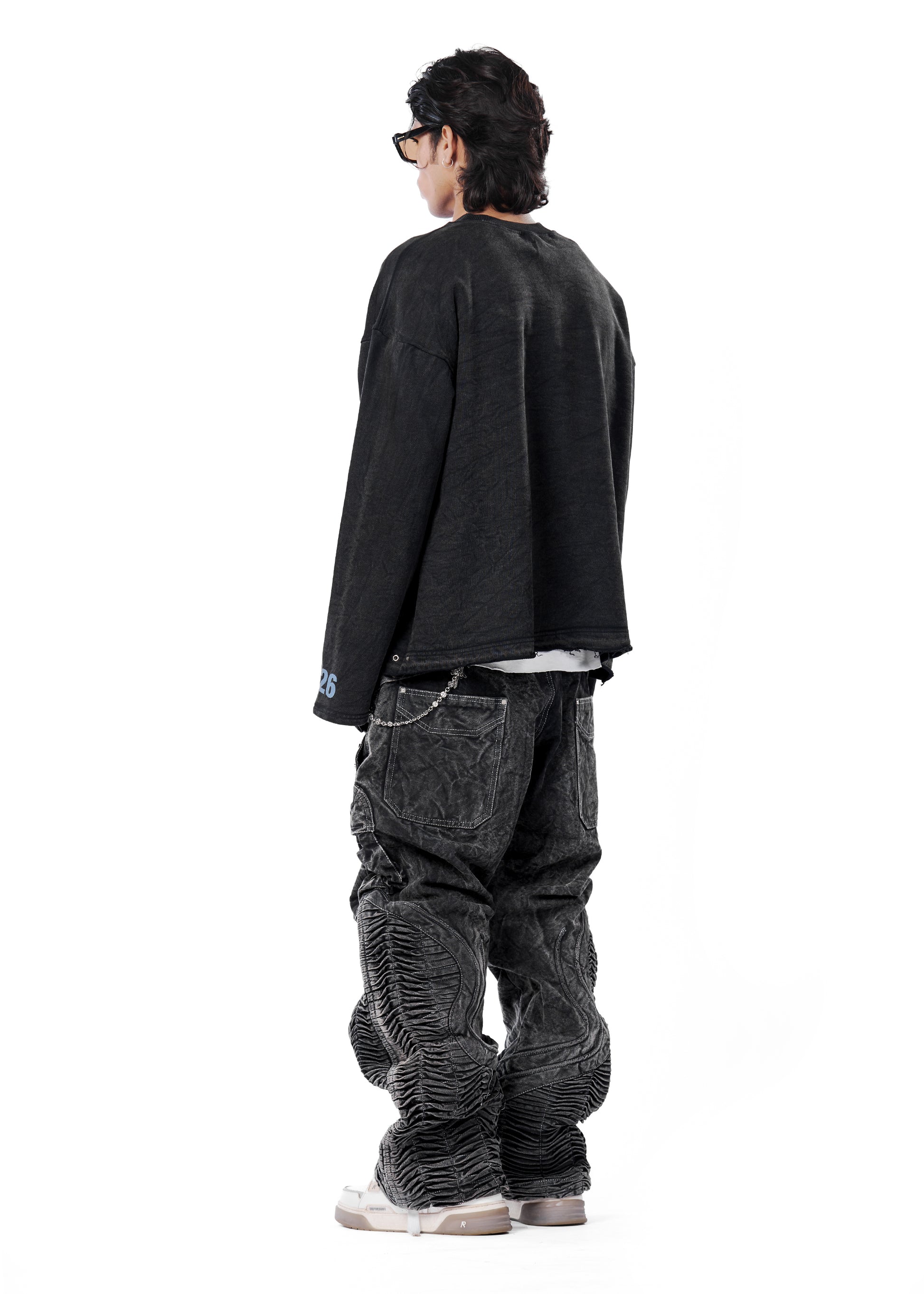 This round-neck, long-sleeve Psy Tee is crafted from 230 GSM single jersey, featuring drop shoulders and a boxy fit. Finished with a dark charcoal stone wash, it showcases flat screen prints inspired by the game Bully across the front and sleeves, complemented by Evemen branding on the front. Each piece is individually washed, taking over 190 minutes to complete ensuring no two garments are exactly alike.